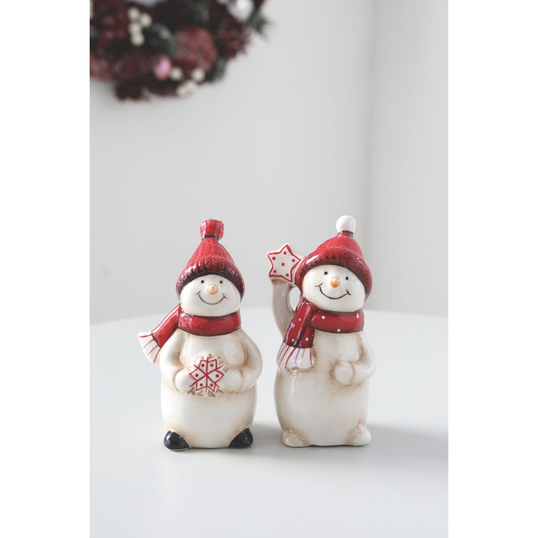 艶やかな陶器の質感と、鮮やかな赤色の帽子とマフラーが目を引く、雪だるまのペアオブジェです。