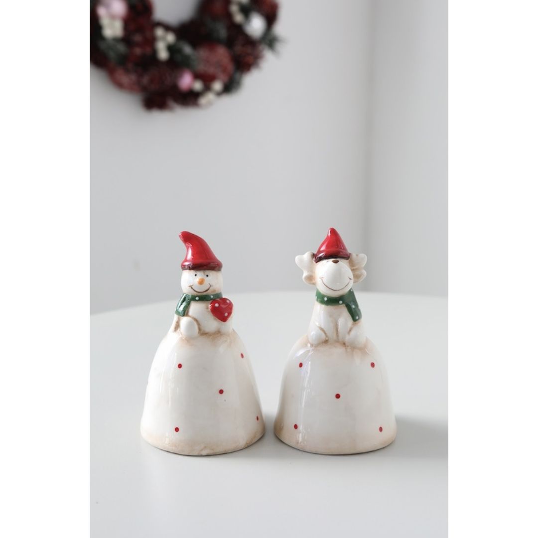 雪だるまとトナカイがモチーフになった、ハンドベルのような形がユニークな陶器オブジェです。