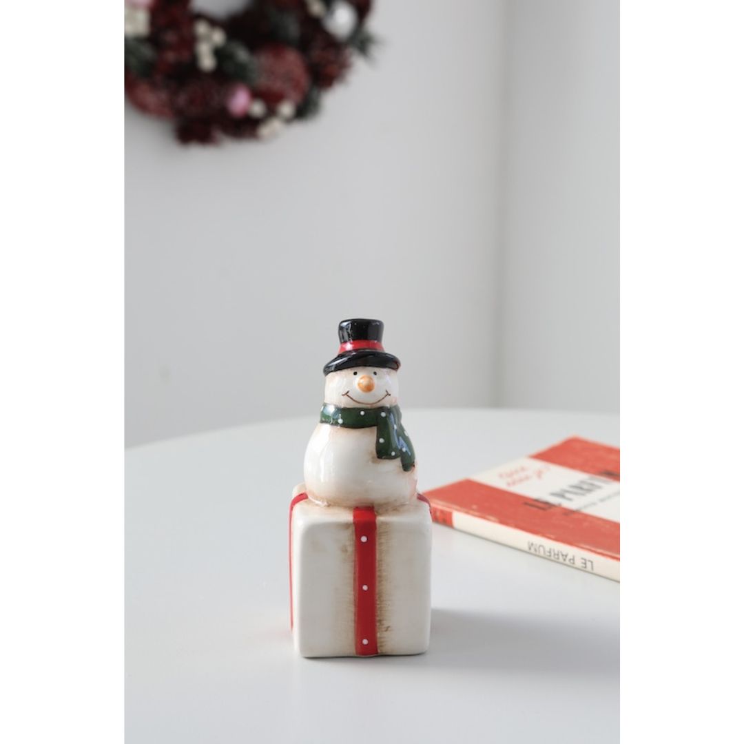 プレゼントボックスの上に乗った、ハットとマフラーをつけた雪だるまのオブジェです。