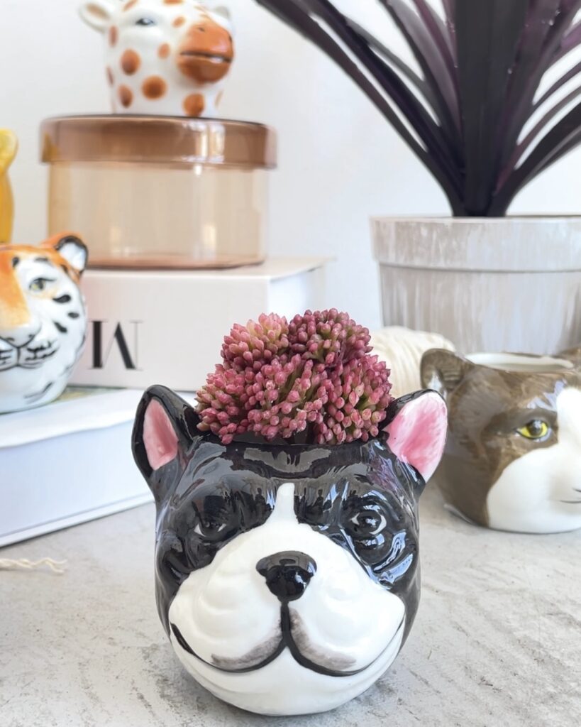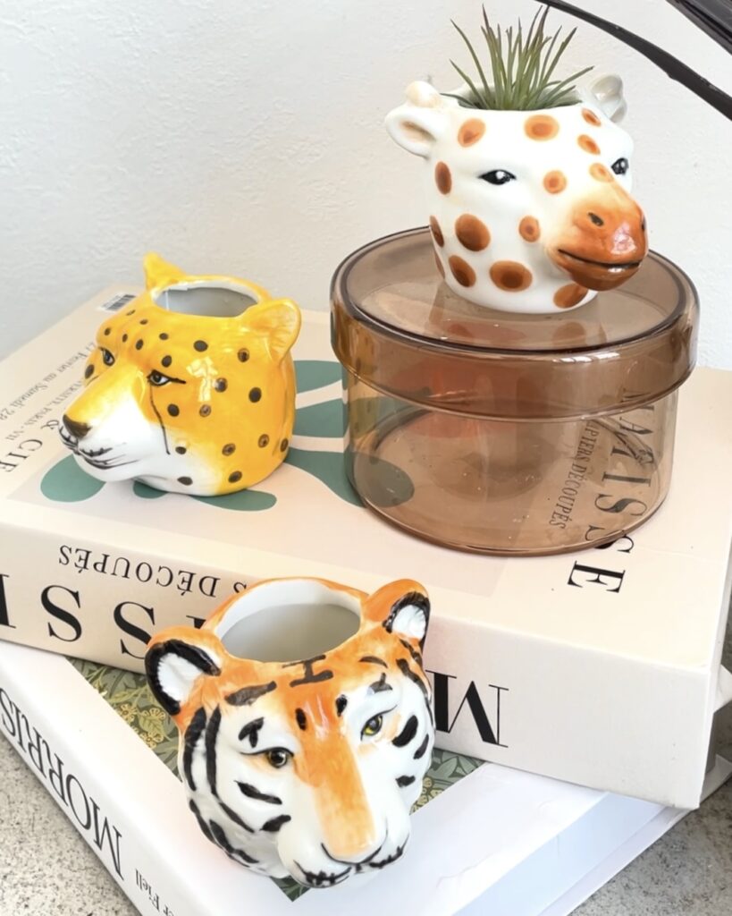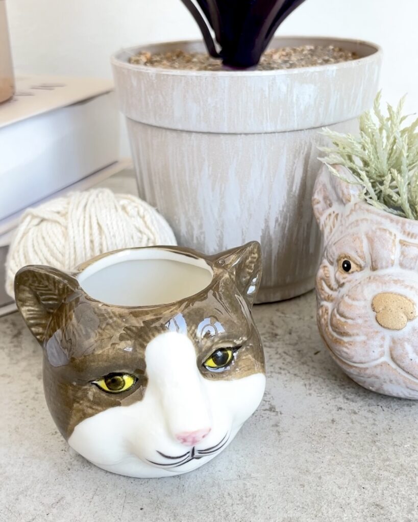 鮮やかな色使いや、細部にこだわった表情が魅力的なこのカップは、小さな多肉植物やエアプランツの鉢として最適。もちろん、アクセサリーや鍵などの小物入れとしても活躍します。