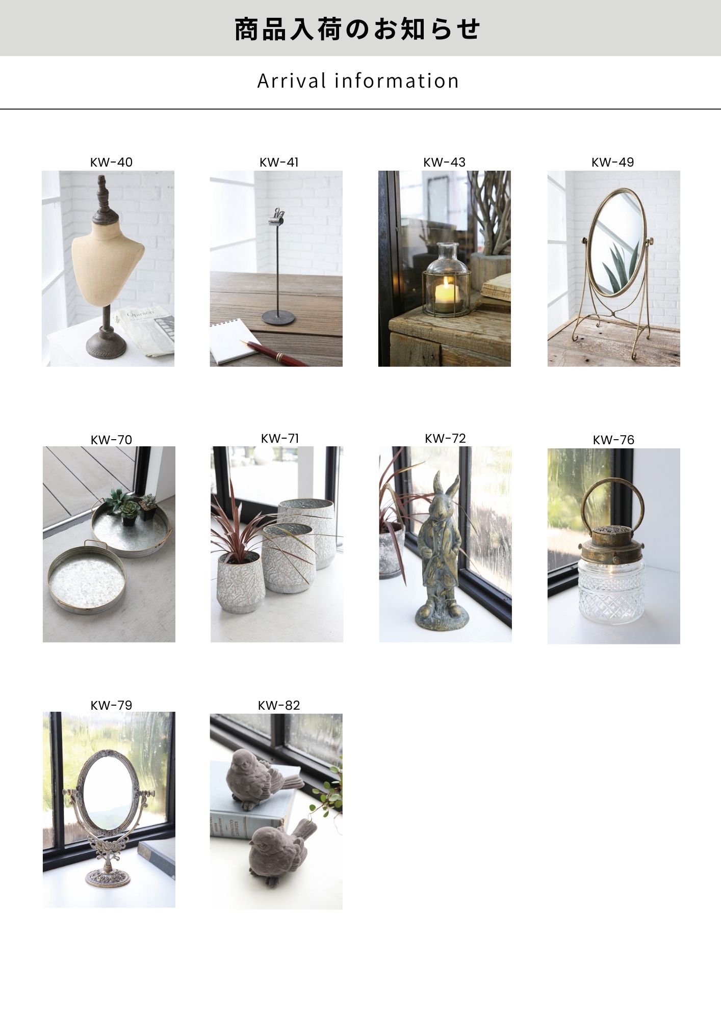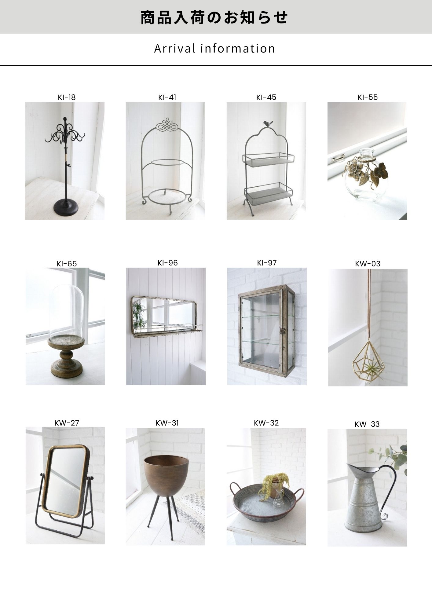 KI KW 商品入荷のお知らせ 2月 22, 2026 | Arrival Information 下記商品が入荷しました。 [KI-18][KI-41][KI-45][KI-55][KI-65][KI-96][KI-97] [KW-03][KW-27][KW-31][KW-32][KW-33][KW-40][KW-41] [KW-43][KW-49][KW-70][KW-71][KW-72][KW-76][KW-79][KW-82]